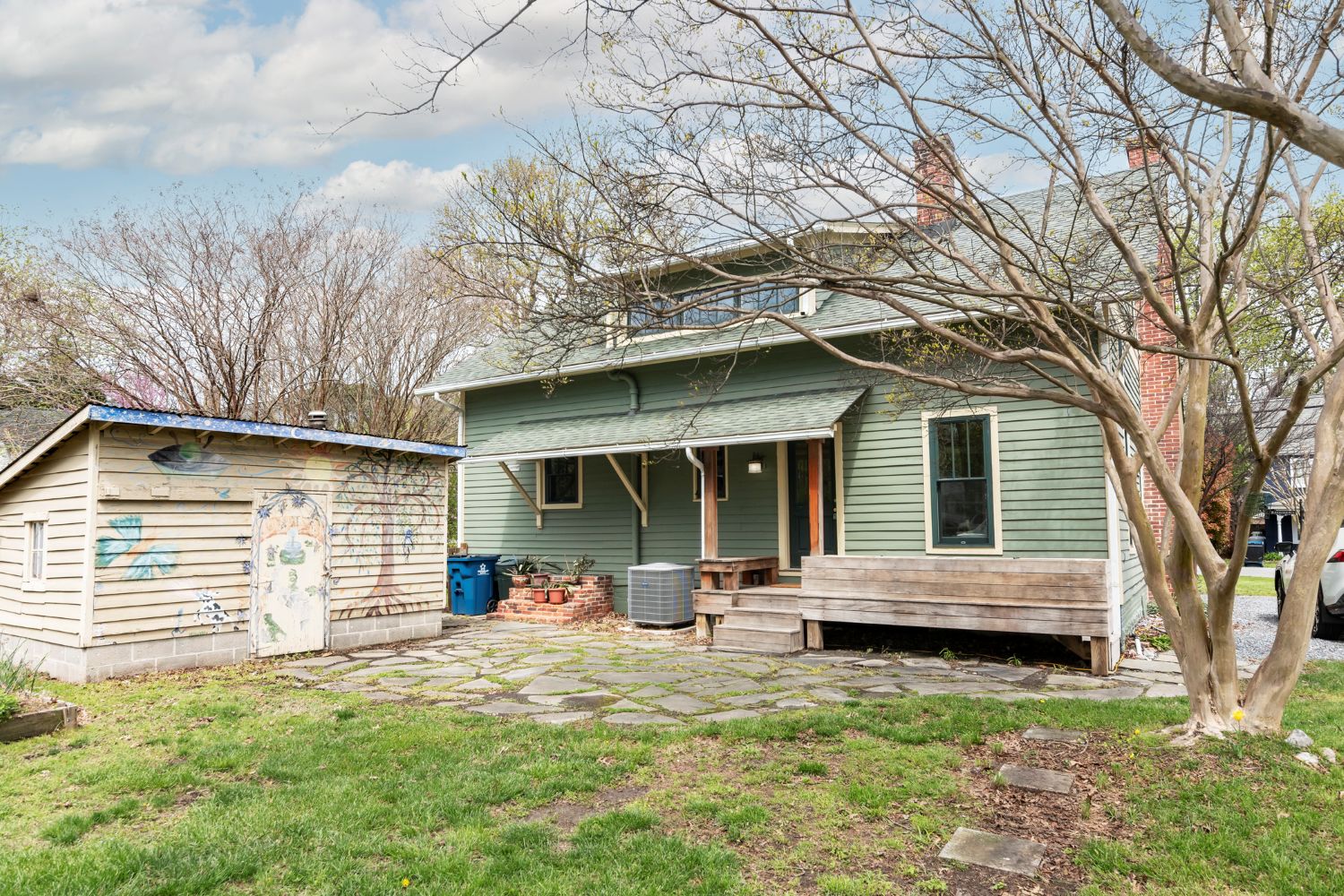 The rear elevation’s deck and steps with a shed roof supported by brackets has the potential to be infilled with walls to become a mud room/laundry. The shed also has potential as an office, studio or a potting shed. The majestic crape myrtle will add color in the summer.
